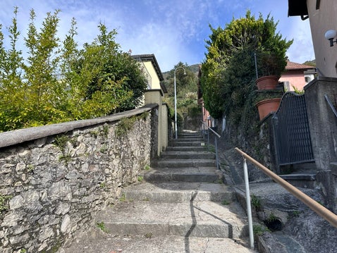 Der Weg schlängelt sich zwischen Häusern hindurch, mal offen, mal versteckt hinter Büschen und Pflanzen. Immer wieder öffnet sich der Blick auf den See und die Berge.